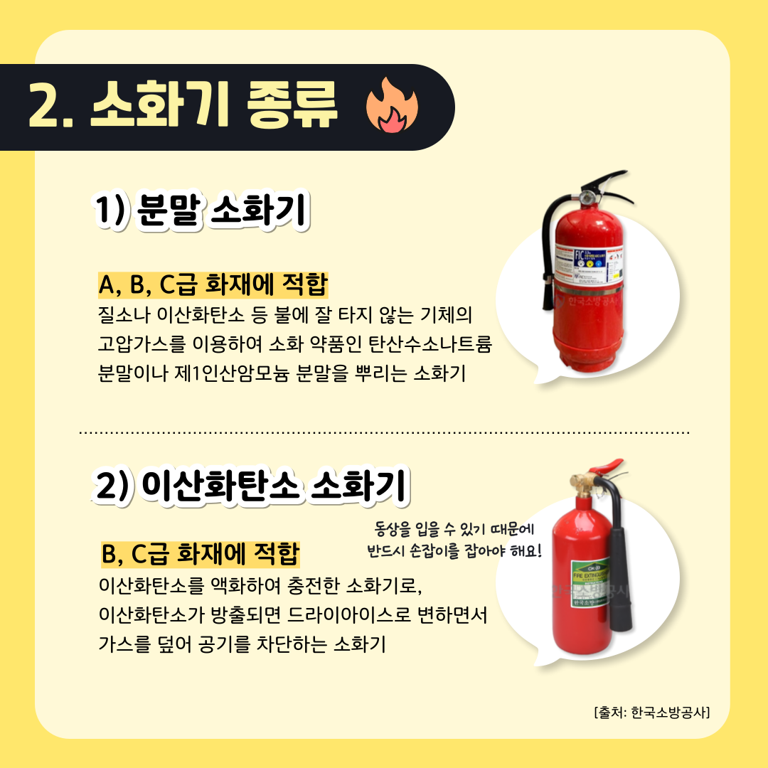 - 특징: 이산화탄소를 분사하여 산소를 차단, 전기화재 및 액체화재 대응