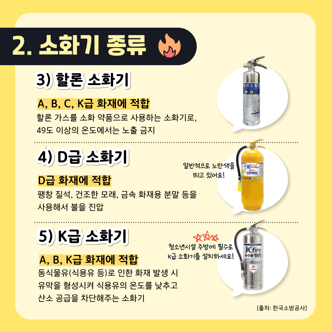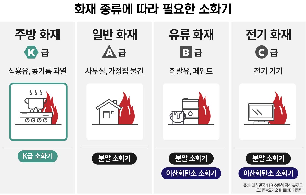 | K급 화재 | 식용유, 동물성 기름 화재 | 주방용 포소화기 |