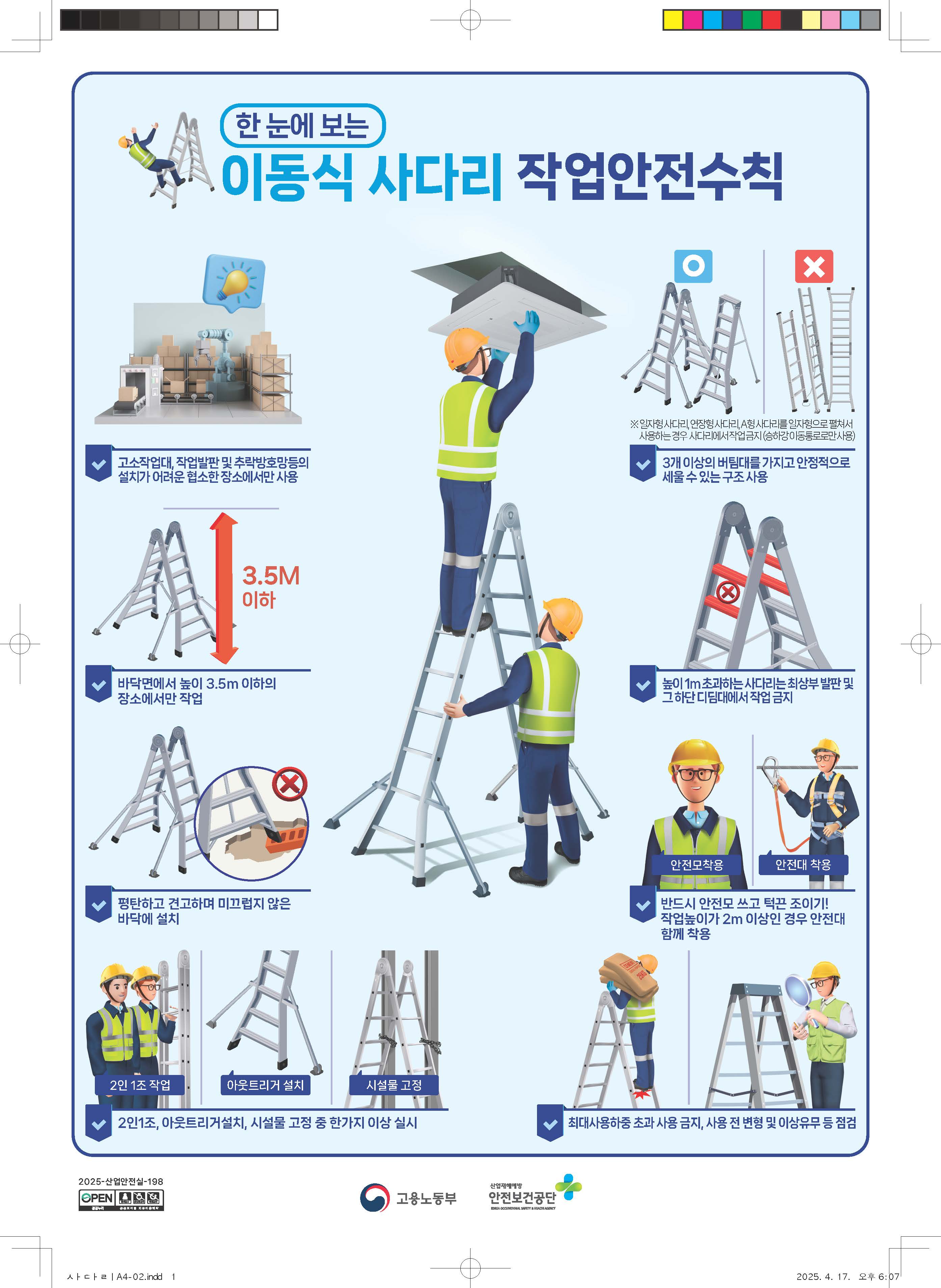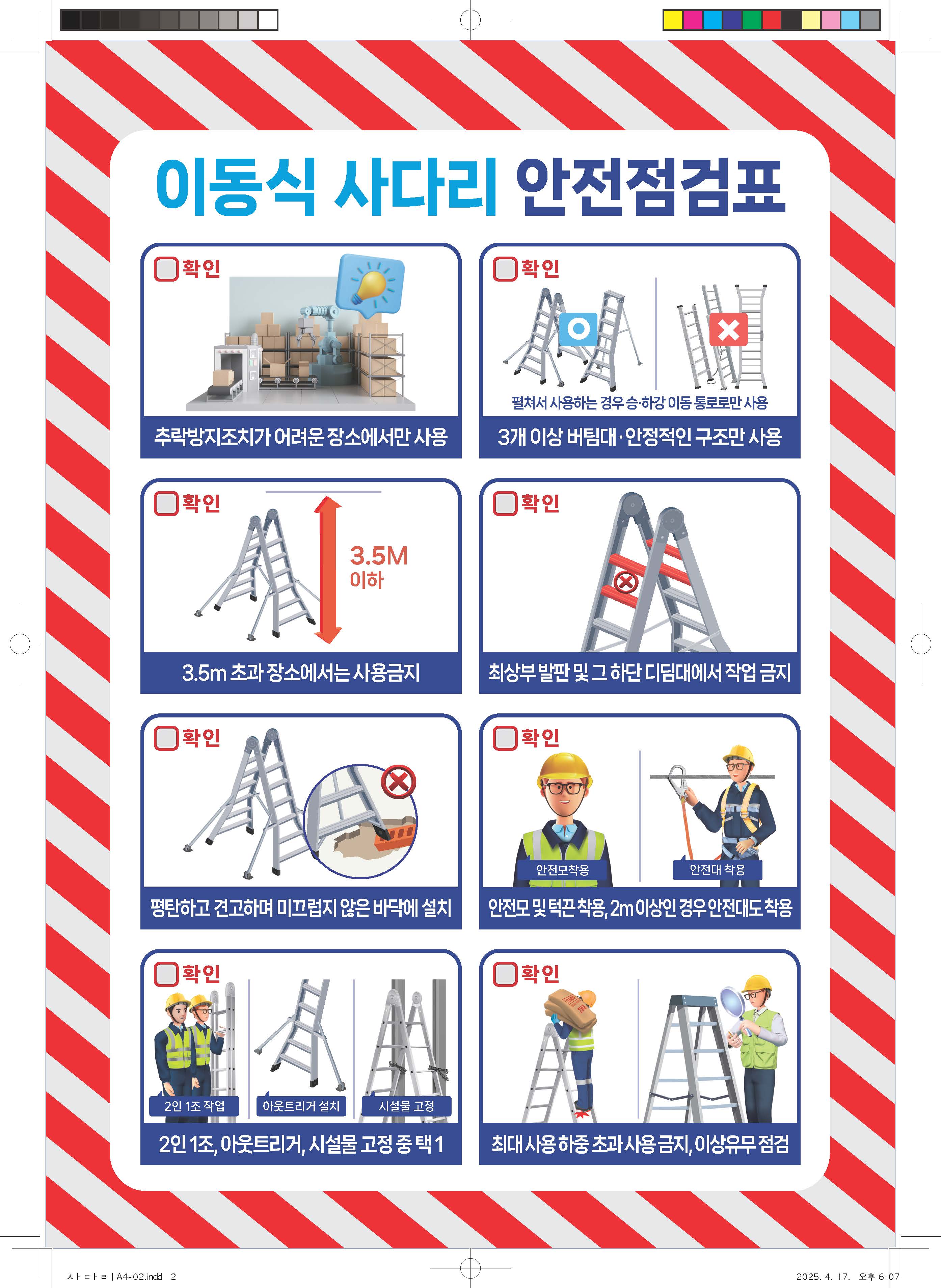 이동식 사다리는 편리한 도구지만, 올바르게 사용하지 않으면 위험한 장비로 전락할 수 있습니다. 지금 이 순간, 사다리를 사용하고 있다면 점검표부터 확인하세요. 동료와 함께 하는 2인 1조 작업, 아웃트리거 설치, 안전모와 안전대 착용… 이 모든 것이 내일의 안전을 담보합니다.